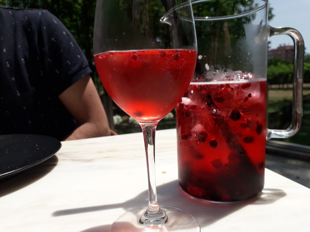 Nós começamos com o couvert, que traz manteiga com chouriço e ainda gema de ovo mesmo no ponto para ser a companhia do pão e da broa. Pedimos o presunto de Leon para fazer par e uma sangria de espumantes e frutos vermelhos para regar um almoço num dia quente de Junho.