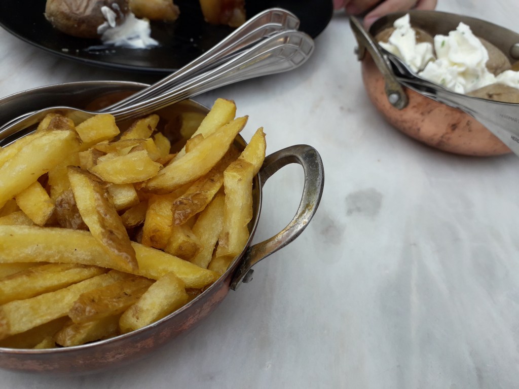 Assim sendo, escolhemos o tomahawk, e como acompanhamentos as batatas fritas rústicas para ele, e as batatas ao sal para mim.