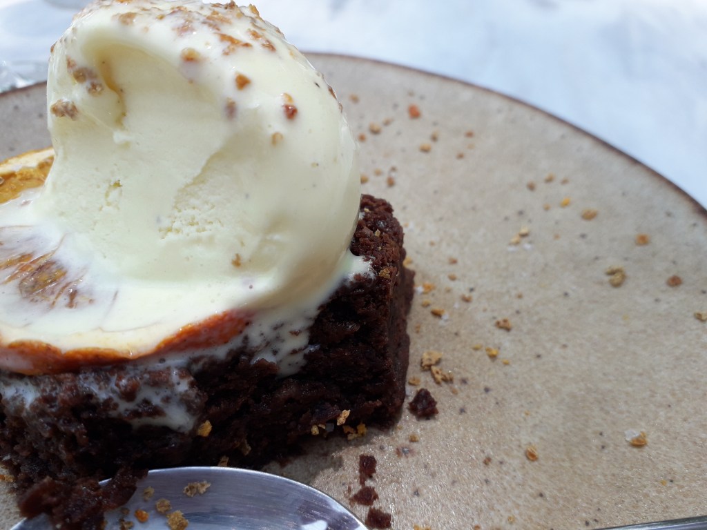 Para sobremesa, o meu marido optou pelo Dom Rodrigo desconstruído e eu pelo brownie de chocolate com laranja salgada e gelado de baunilha. Nada desapontou ❤️