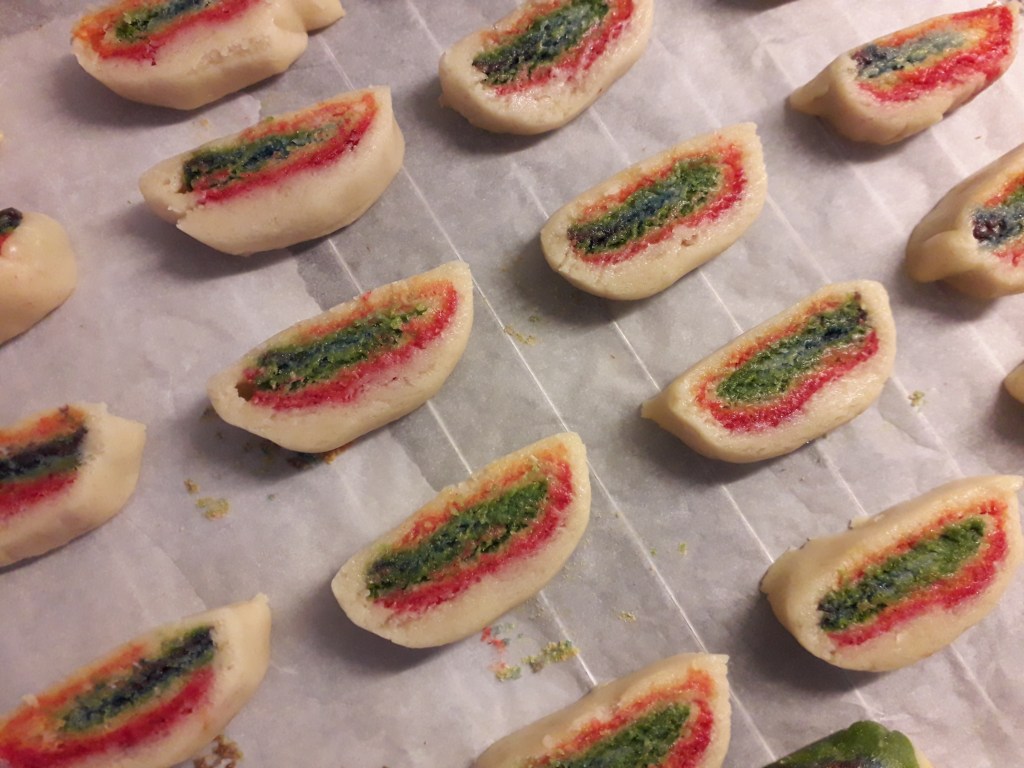 Hoje de manhã, a Pipoca mais velha é eu fomos para a cozinha fazer bolachas. Não foram umas bolachas quaisquer: foram bolachas arco-íris!