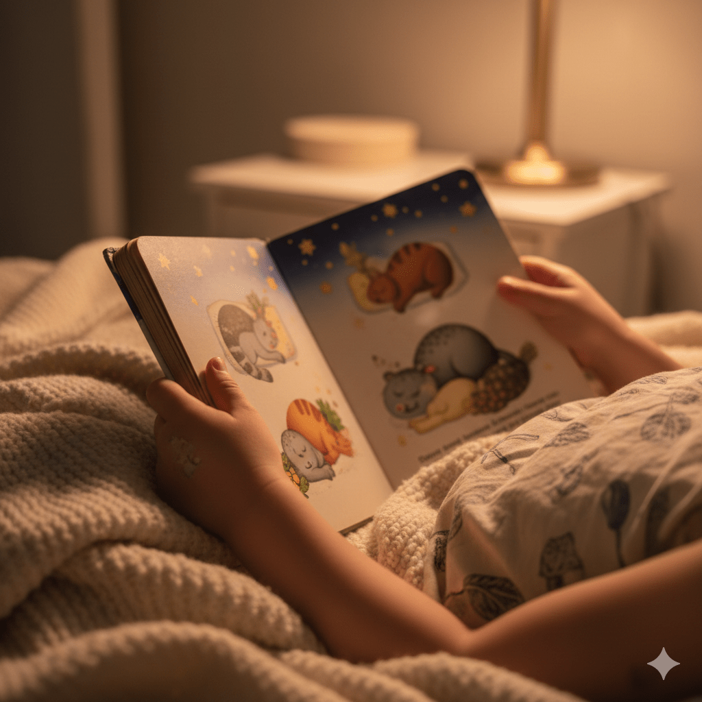 Ouvir uma história, num ambiente tranquilo, reduz o ritmo do dia. A respiração abranda, o corpo relaxa e a transição para o sono acontece de forma mais natural.