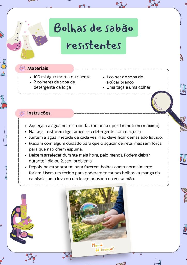 É uma daquelas actividades que acaba por gerar conversa: porquê o açúcar? O que faz o detergente? Como é que a bolha aguenta? Não precisam de ter todas as respostas na ponta da língua! Parte da graça é descobrirem juntos.